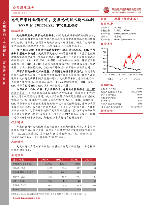 【东亚前海证券】【20221215】20221215-东亚前海证券-宇邦新材-301266.SZ-首次覆盖报告:光伏焊带行业领军者,受益光伏技术迭代红利-40页