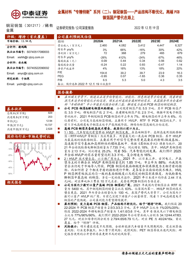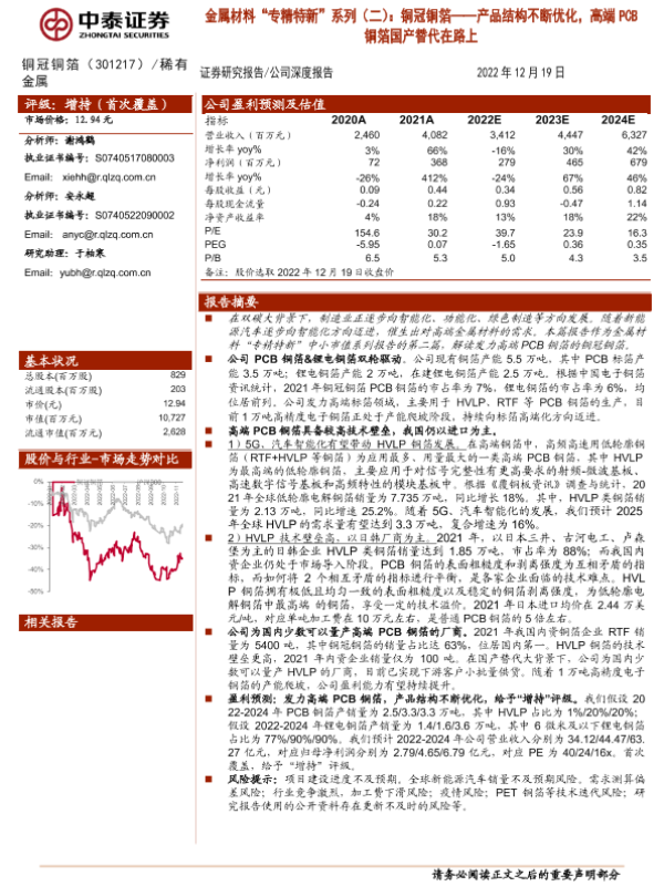 【中泰证券】【20221219】金属材料“专精特新”系列(二):铜冠铜箔——产品结构不断优化,高端PCB铜箔国产替代在路上-18页