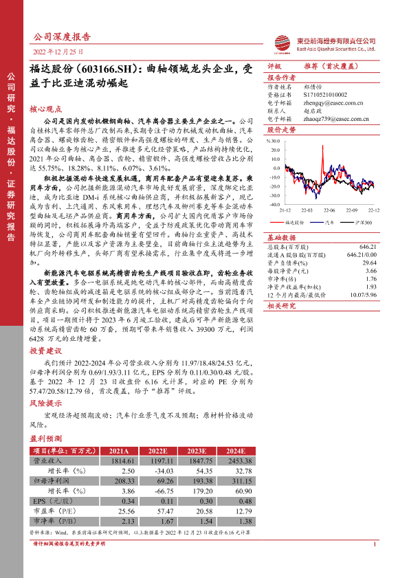 【东亚前海证券】【20221225】福达股份:曲轴领域龙头企业,受益于比亚迪混动崛起-24页