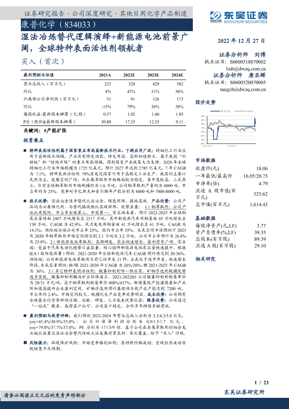 【东吴证券】【20221227】湿法冶炼替代逻辑演绎+新能源电池前景广阔,全球特种表面活性剂领航者-23页