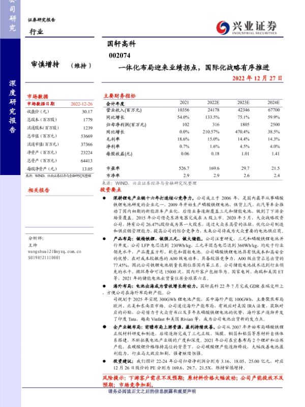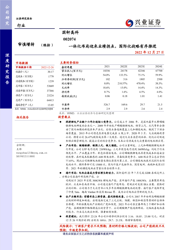 业绩拐点 储能业务 国际化战略 磷酸铁锂电池 锂电行业