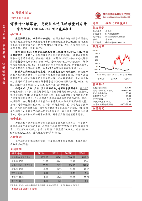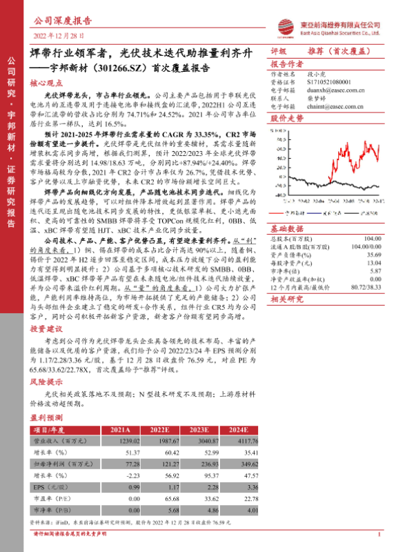 【东亚前海证券】【20221228】焊带行业领军者,光伏技术迭代助推量利齐升——宇邦新材(301266.SZ)首次覆盖报告-40页