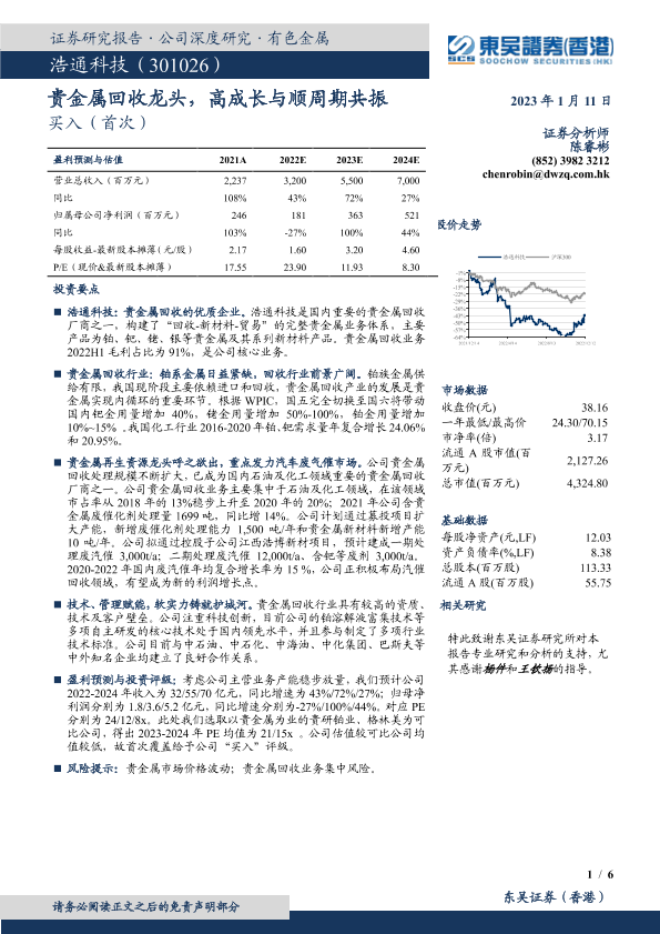 【东吴证券(香港)】【20230111】浩通科技-301026.SZ-贵金属回收龙头,高成长与顺周期共振-6页