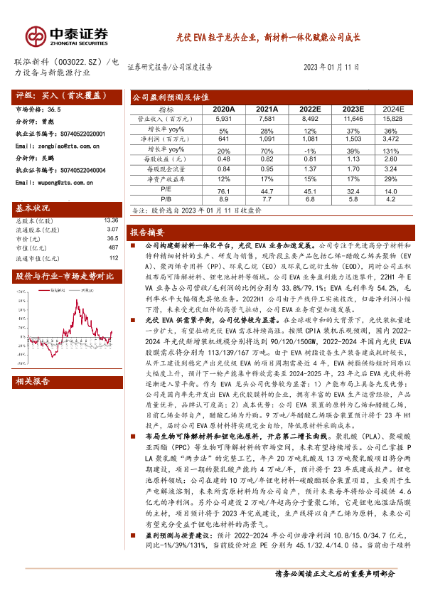 【中泰证券】【20230111】20230111-中泰证券-联泓新科-003022.SZ-光伏EVA粒子龙头企业,新材料一体化赋能公司成长-28页