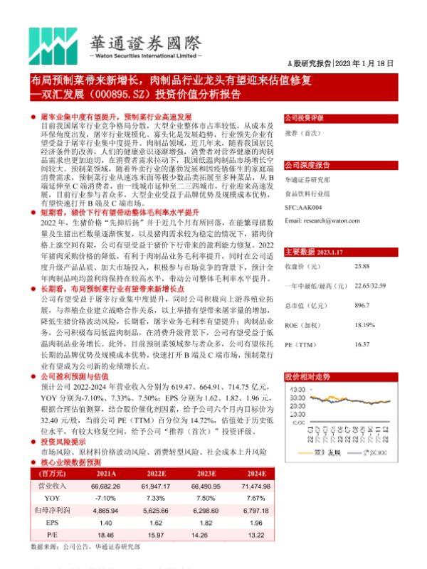 【华通证券国际】【20230118】布局预制菜带来新增长,肉制品行业龙头有望迎来估值修复 —双汇发展(000895.SZ)投资价值分析报告-37页
