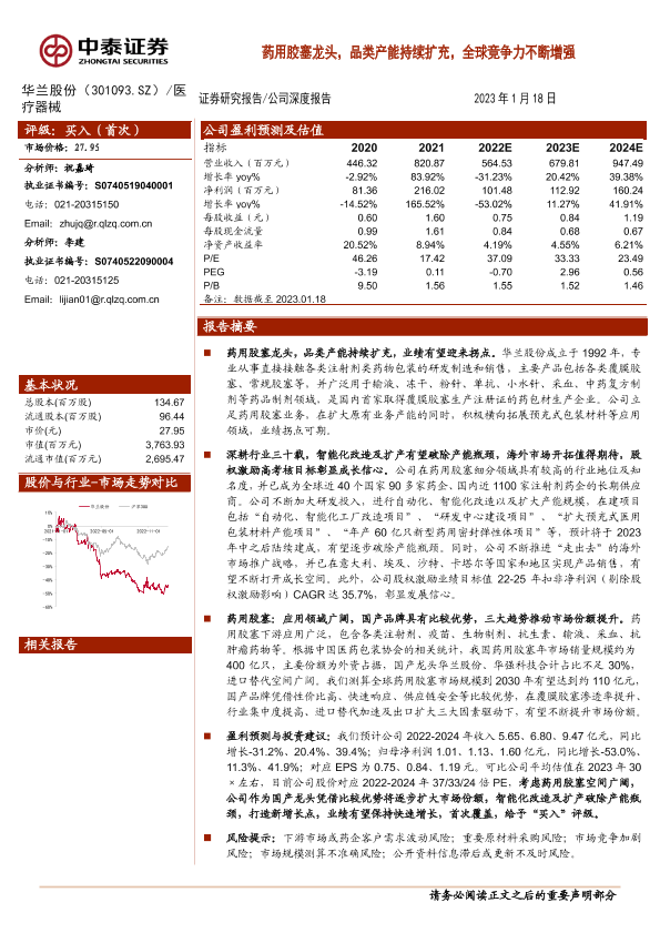 【中泰证券】【20230118】20230118-中泰证券-华兰股份-301093.SZ-药用胶塞龙头,品类产能持续扩充,全球竞争力不断增强-21页