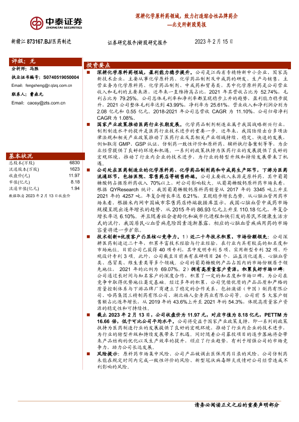 【中泰证券】【20230215】深耕化学原料药领域,致力打造综合性品牌药企 —北交所新股简报-21页