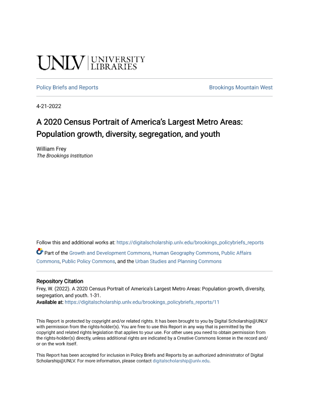 【The Brookings Institution】【202205】A 2020 Census Portrait of America’s Largest Metro Areas Population growth, diversity, segregation, and youth-32页