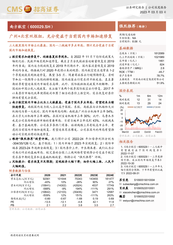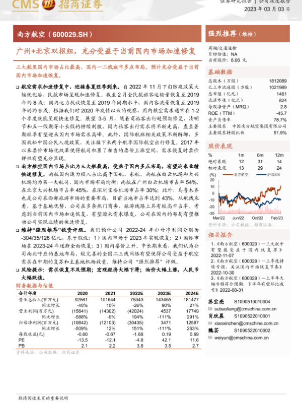 南方航空 国内市场 广州+北京双枢纽 票价弹性 航空需求恢复