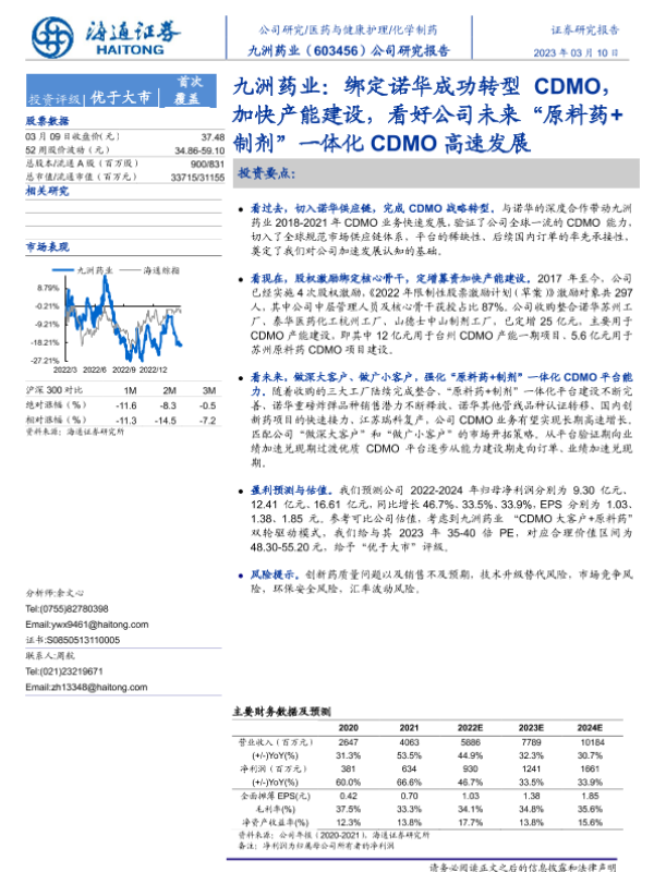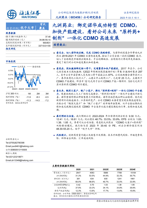 【海通证券】【20230310】九洲药业:绑定诺华成功转型CDMO,加快产能建设,看好公司未来“原料药+制剂”一体化CDMO高速发展-32页