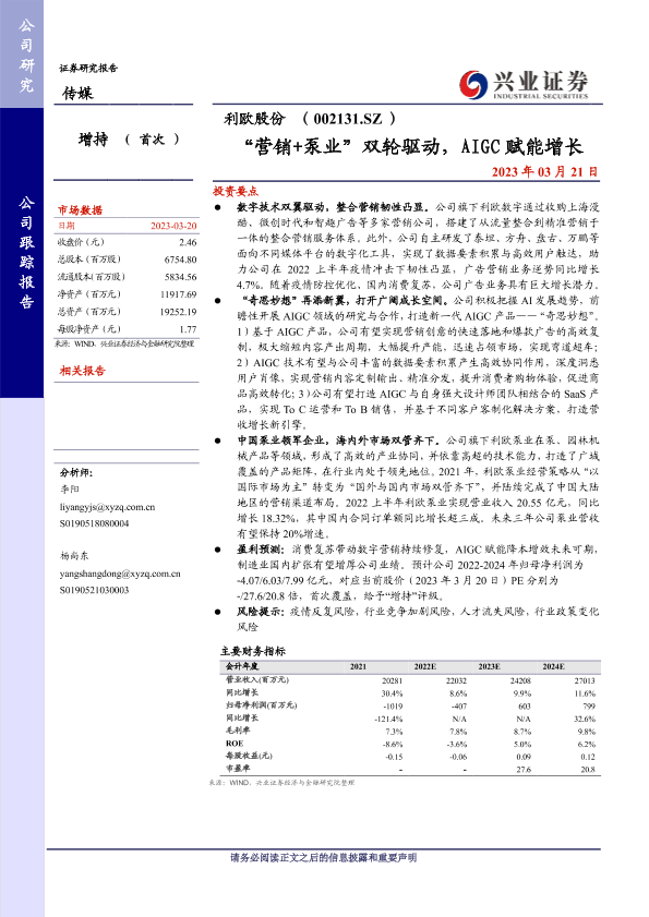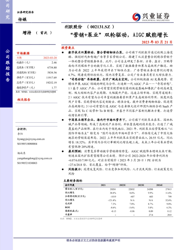 AIGC 利欧股份 数字营销 泵业制造 财务分析