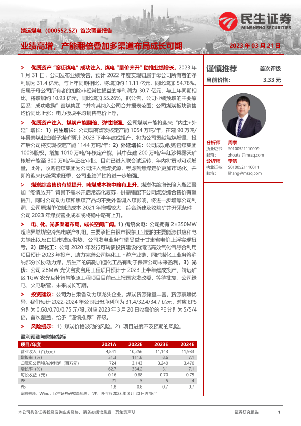【民生证券】【20230321】靖远煤电(000552.SZ)首次覆盖报告:业绩高增,产能翻倍叠加多渠道布局成长可期-20页