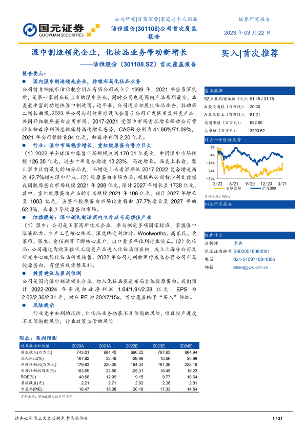 【国元证券】【20230322】20230322-国元证券-洁雅股份-301108.SZ-首次覆盖报告:湿巾制造领先企业,化妆品业务带动新增长-21页