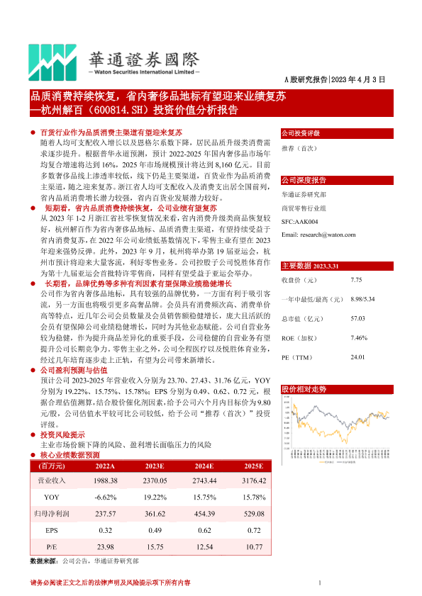 【华通证券国际】【20230403】品质消费持续恢复,省内奢侈品地标有望迎来业绩复苏 —杭州解百(600814.SH)投资价值分析报告-22页