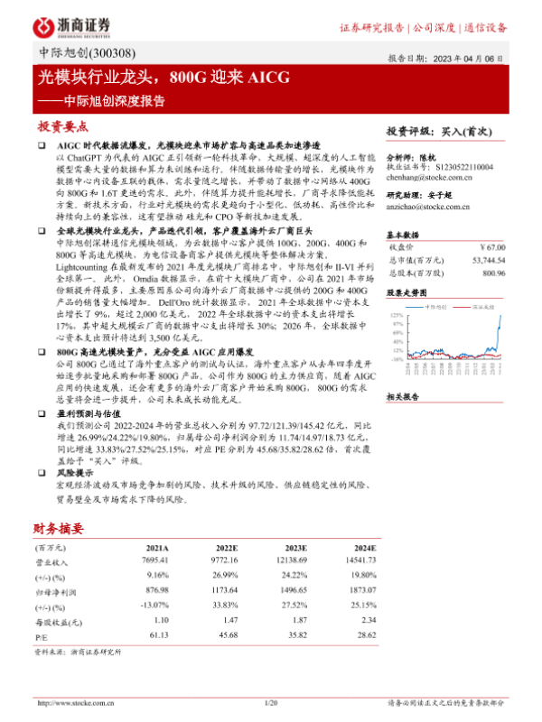 【浙商证券】【20230406】中际旭创深度报告:光模块行业龙头,800G迎来AICG-20页