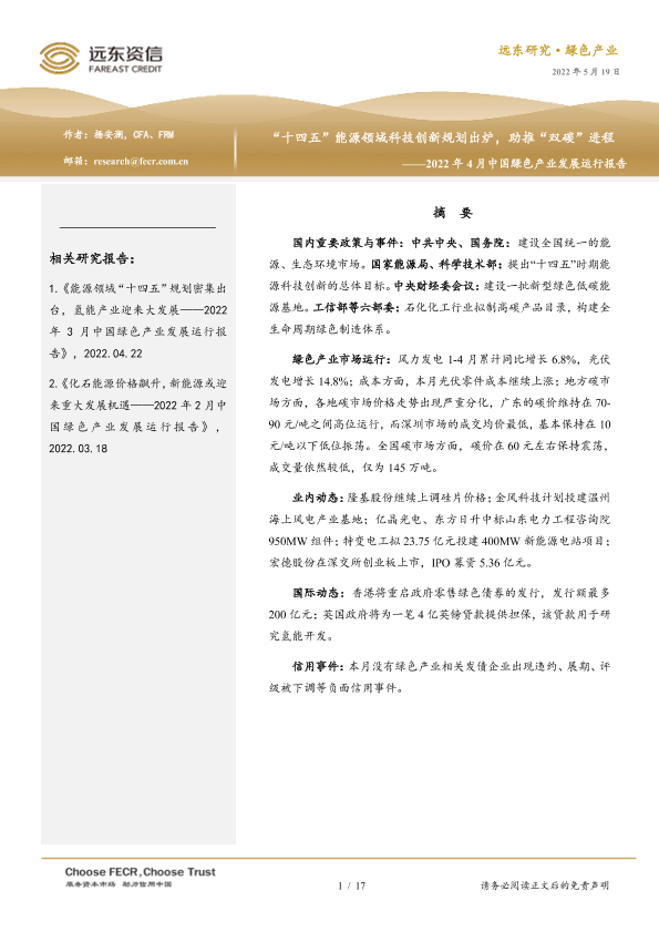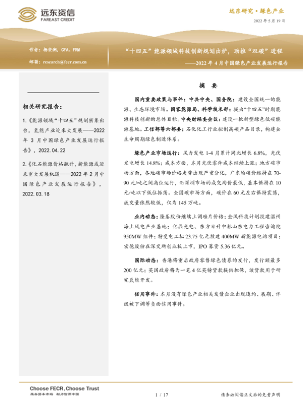 【远东资信】【20220519】2022年4月中国绿色产业发展运行报告:“十四五”能源领域科技创新规划出炉,助推“双碳”进程-17页