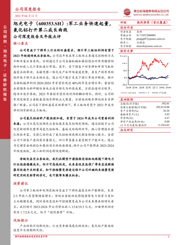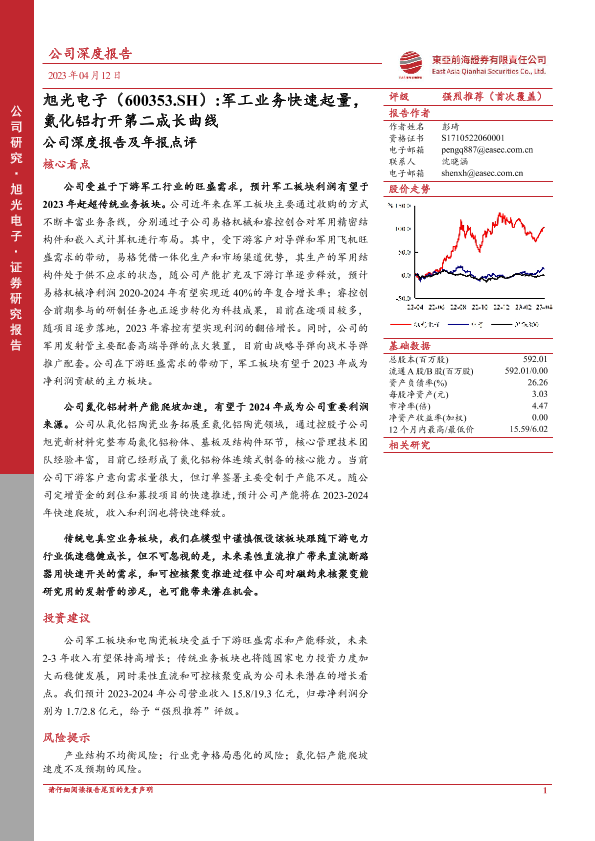【东亚前海证券】【20230412】旭光电子-600353.SH-公司深度报告及年报点评:军工业务快速起量,氮化铝打开第二成长曲线-22页