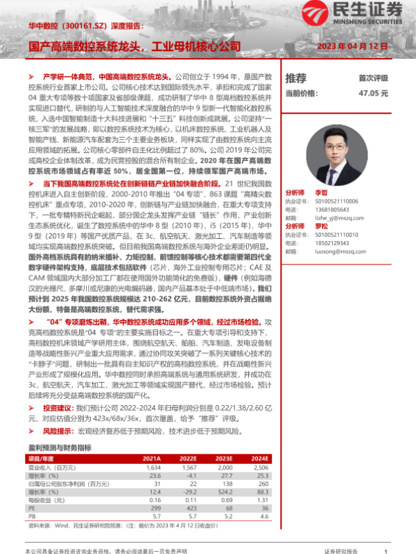 【民生证券】【20230412】20230412-民生证券-华中数控-300161.SZ-深度报告:国产高端数控系统龙头,工业母机核心公司-30页