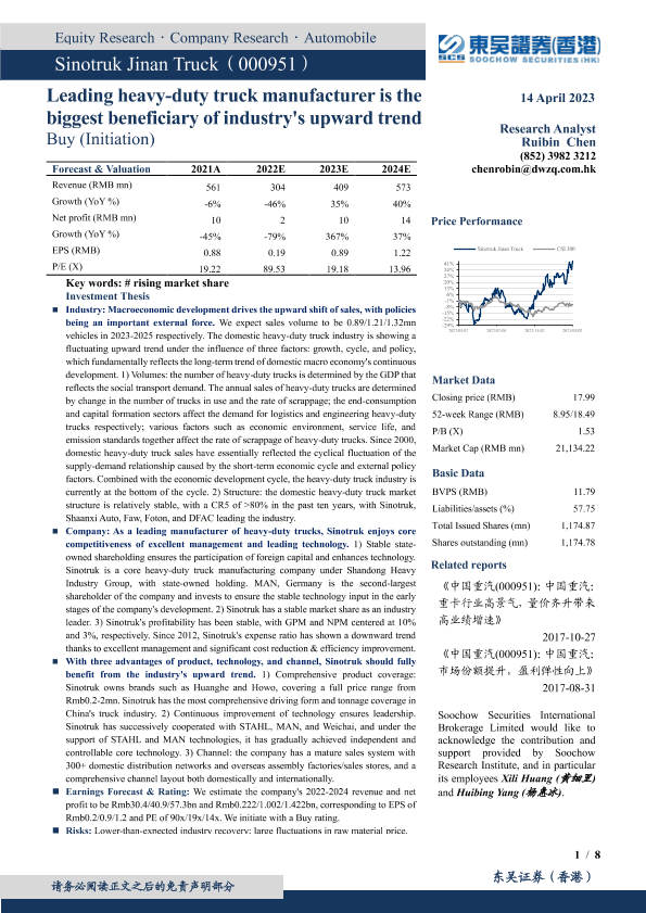 【东吴证券(香港)】【20230414】中国重汽-000951.SZ-重卡整车制造龙头,行业上行最大受益者-8页