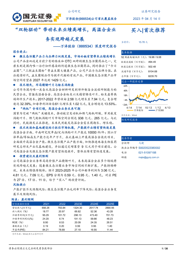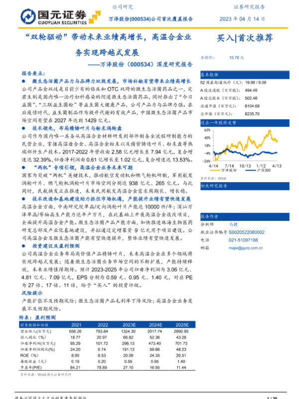 【国元证券】【20230414】“双轮驱动”带动未来业绩高增长,高温合金业务实现跨越式发展——万泽股份(000534)深度研究报告-30页