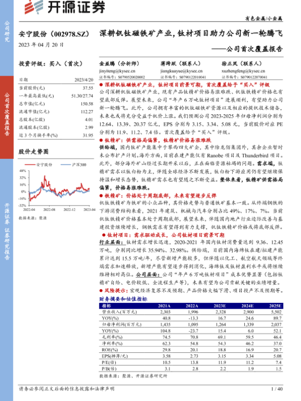 【开源证券】【20230420】20230420-开源证券-安宁股份-002978.SZ-公司首次覆盖报告:深耕钒钛磁铁矿产业,钛材项目助力公司新一轮腾飞-40页