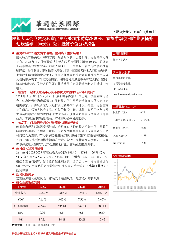 【华通证券国际】【20230421】红旗连锁(002697.SZ)投资价值分析报告:成都大运会商超类独家供应商叠加旅游客流增长,有望带动便利店业绩提升-21页