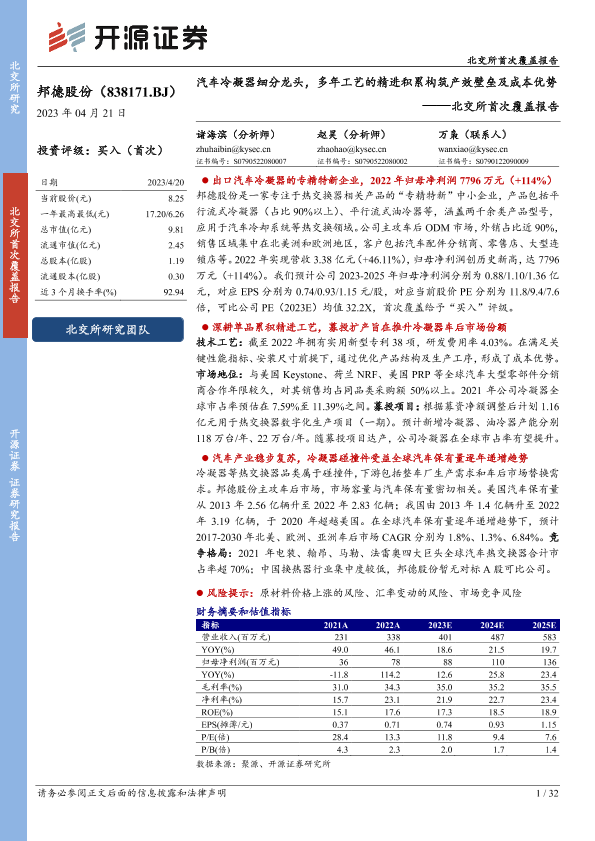【开源证券】【20230421】北交所首次覆盖报告:汽车冷凝器细分龙头,多年工艺的精进积累构筑产效壁垒及成本优势-32页