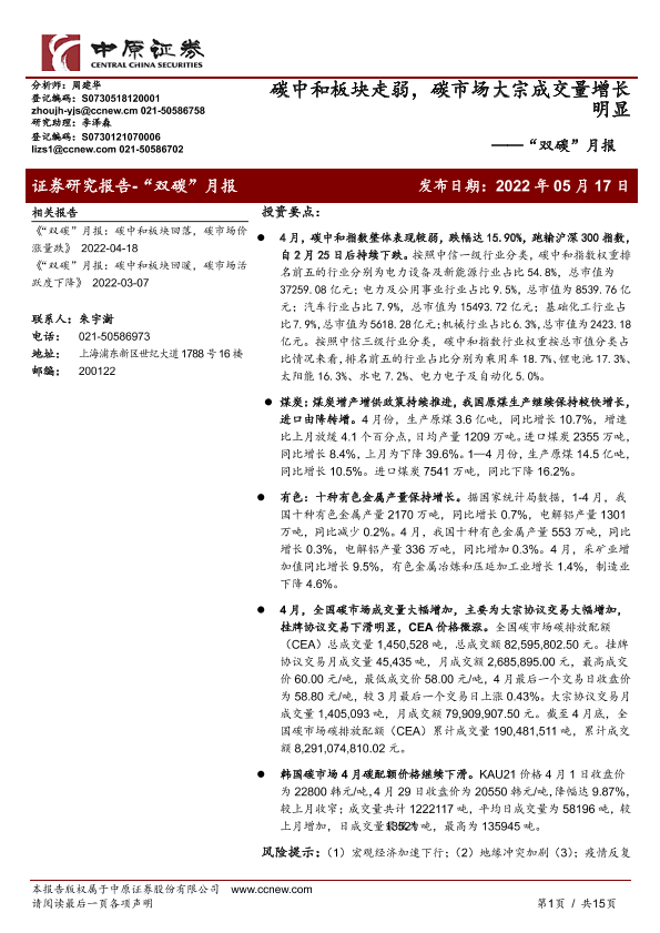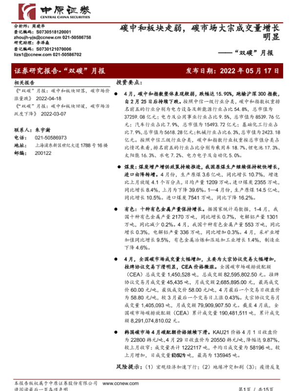 【中原证券】【20220517】“双碳”月报:碳中和板块走弱,碳市场大宗成交量增长明显-15页