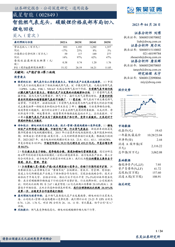 【东吴证券】【20230428】威星智能(002849):智能燃气表龙头,碳酸锂价格底部布局切入锂电回收-24页