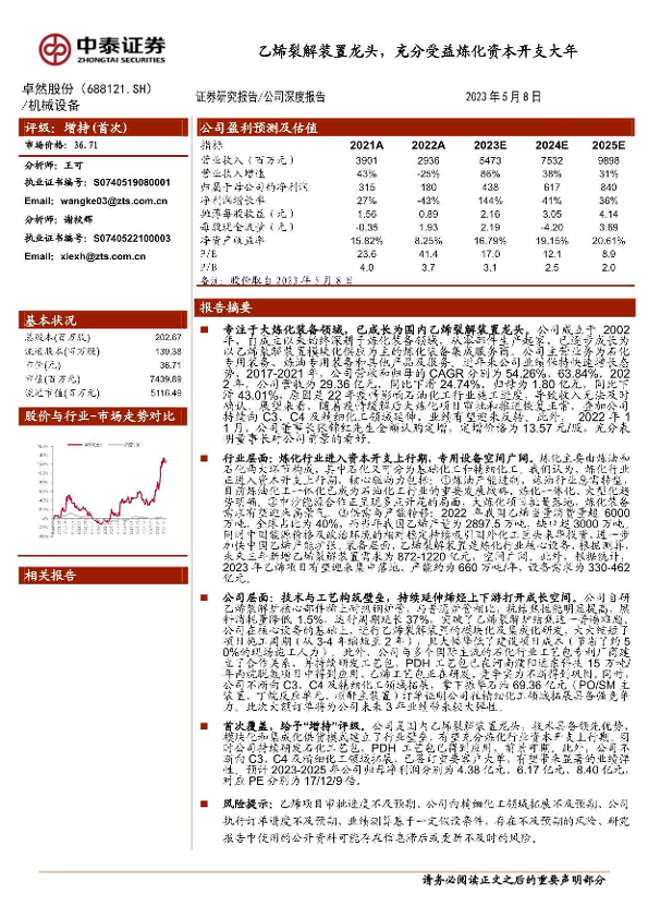【中泰证券】【20230508】20230508-中泰证券-卓然股份-688121.SH-乙烯裂解装置龙头,充分受益炼化资本开支大年-28页
