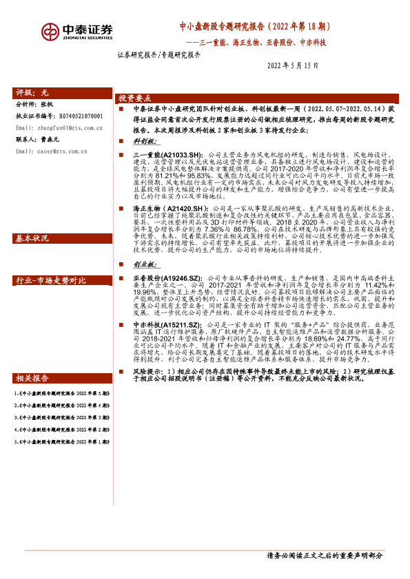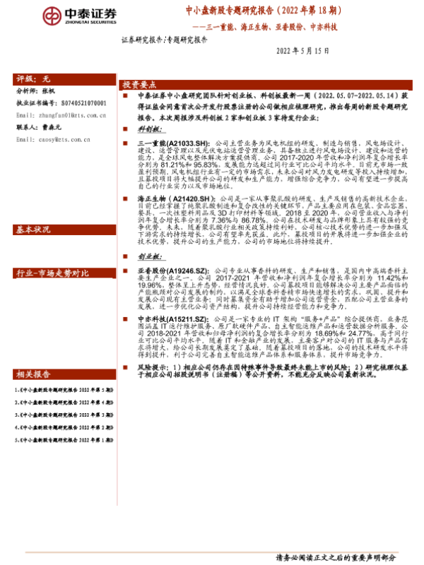 【中泰证券】【20220515】中小盘新股专题研究报告(2022年第18期):三一重能、海正生物、亚香股份、中亦科技-21页