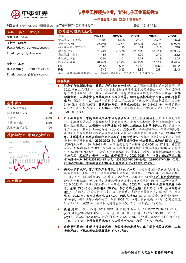 【中泰证券】【20230514】20230514-中泰证券-圣晖集成-603163.SH-深度报告:洁净室工程领先企业,专注电子工业高端领域-39页