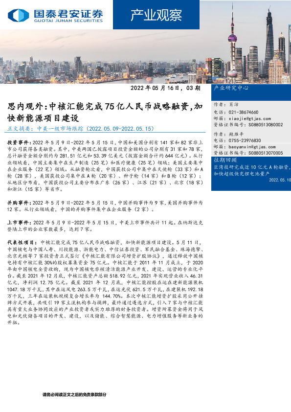 【国泰君安证券】【20220516】产业观察:思内观外,中核汇能完成75亿人民币战略融资,加快新能源项目建设-29页