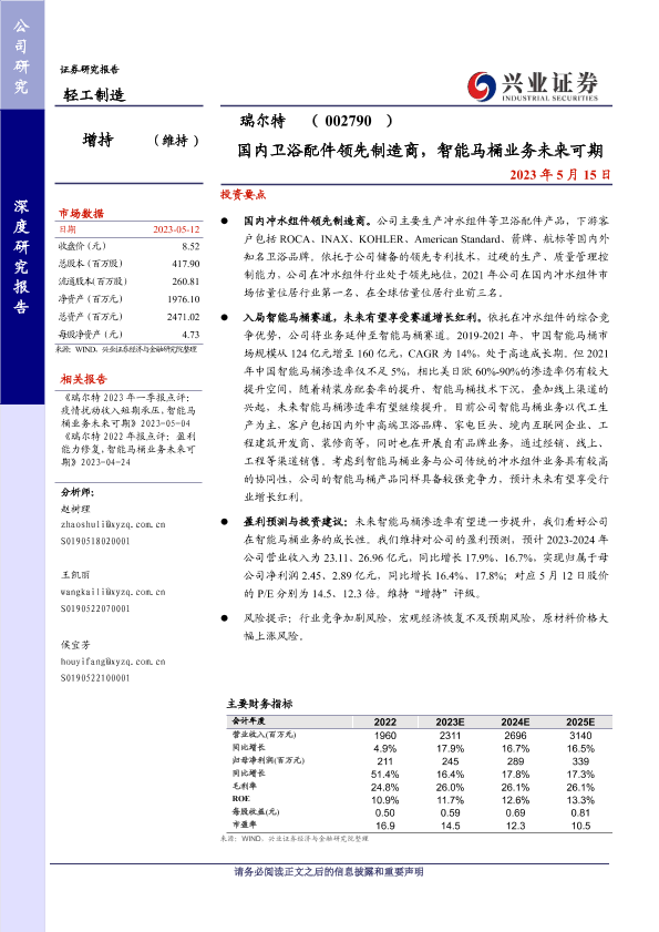 兴业证券 制造业 卫浴配件 智能马桶 瑞尔特
