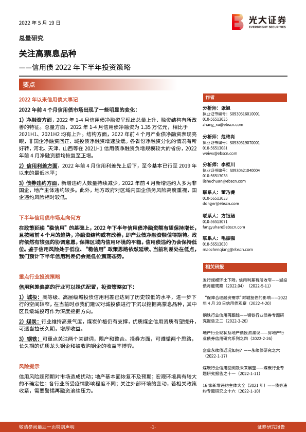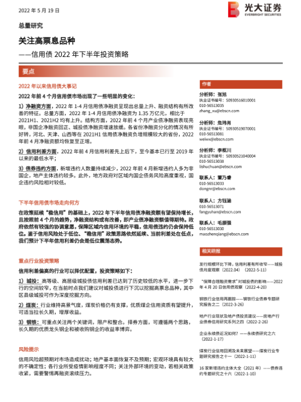 【光大证券】【20220519】信用债2022年下半年投资策略:关注高票息品种-22页