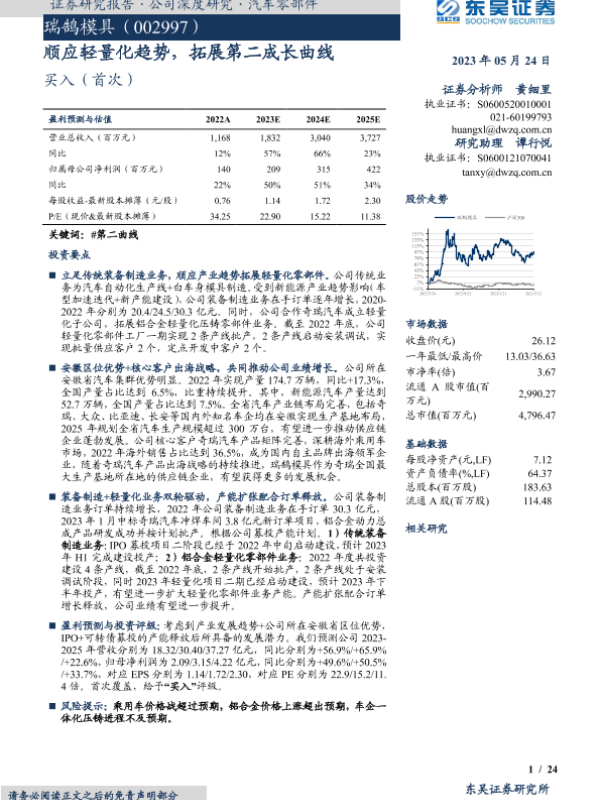 【东吴证券】【20230524】瑞鹄模具(002997):顺应轻量化趋势,拓展第二成长曲线-24页