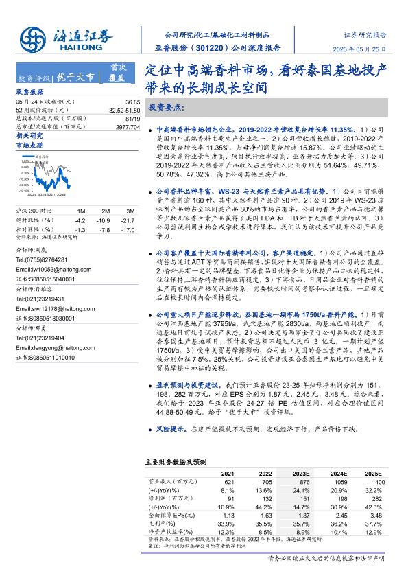 【海通证券】【20230525】20230525-海通证券-亚香股份-301220.SZ-公司深度报告:定位中高端香料市场,看好泰国基地投产带来的长期成长空间-20页