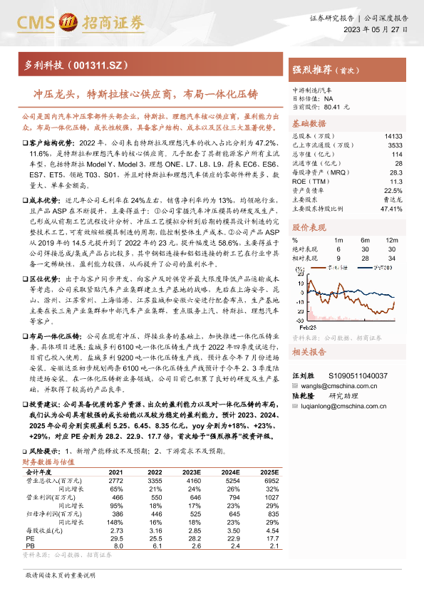 【海通证券】【20230527】多利科技-001311.SZ-冲压龙头,特斯拉核心供应商,布局一体化压铸-23页