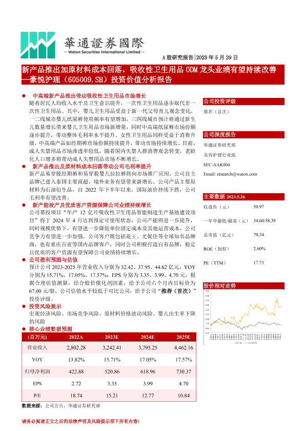 【华通证券国际】【20230529】豪悦护理(605009.SH)投资价值分析报告:新产品推出加原材料成本回落,吸收性卫生用品ODM龙头业绩有望持续改善-22页