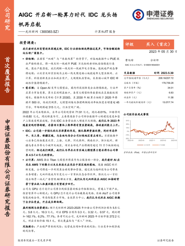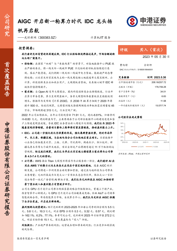 【申港证券】【20230530】AIGC开启新一轮算力时代,IDC龙头扬帆再启航——光环新网(300383.SZ)-27页