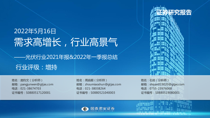 【国泰君安证券】【20220516】光伏行业2021年报&2022年一季报总结:需求高增长,行业高景气-24页
