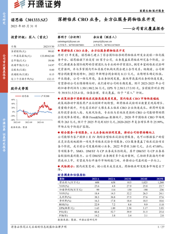 【开源证券】【20230531】诺思格-301333.SZ-公司首次覆盖报告:深耕临床CRO业务,全方位服务药物临床开发-27页