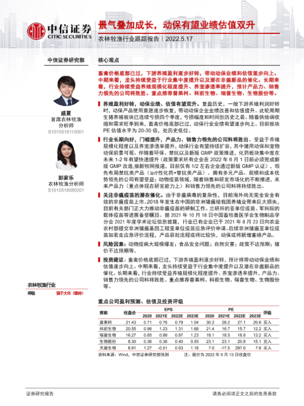 【中信证券】【20220517】农林牧渔行业跟踪报告:景气叠加成长,动保有望业绩估值双升-30页