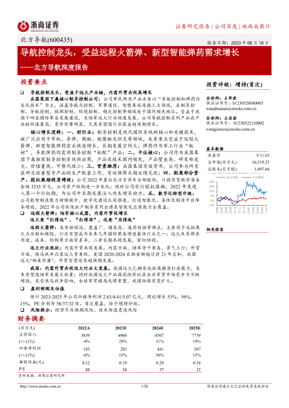 【浙商证券】【20230619】北方导航深度报告:导航控制龙头,受益远程火箭弹、新型智能弹药需求增长-20页