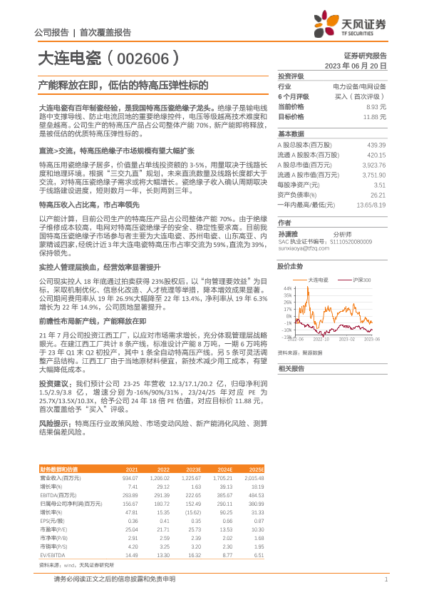 【天风证券】【20230620】20230620-天风证券-大连电瓷-002606.SZ-产能释放在即,低估的特高压弹性标的-21页