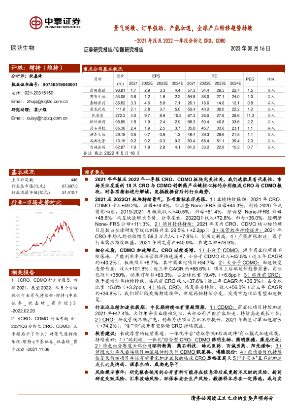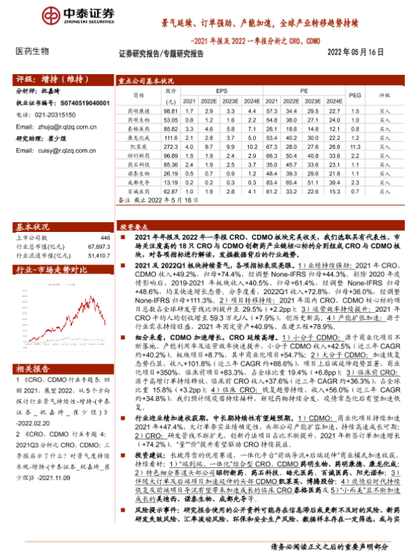 【中泰证券】【20220516】医药生物行业2021年报及2022一季报分析之CRO、CDMO:景气延续、订单强劲、产能加速,全球产业转移趋势持续-28页