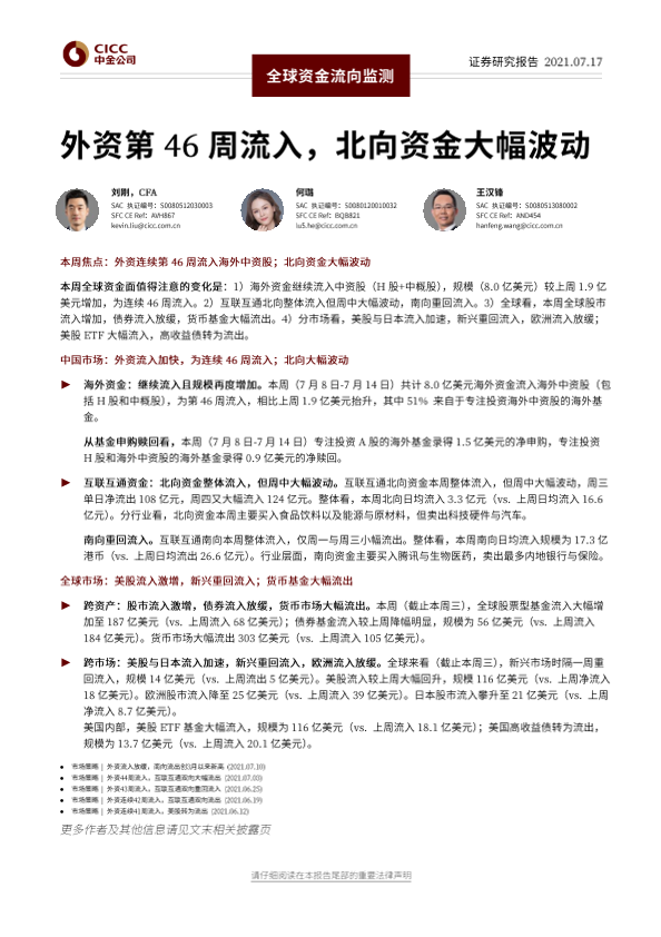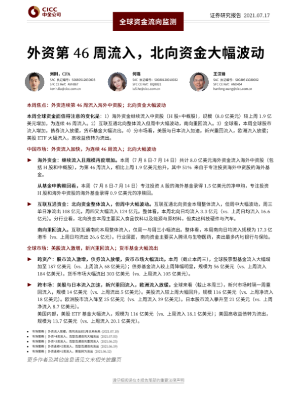 【中金公司】【20210717】全球资金流向监测:外资第46周流入,北向资金大幅波动-17页