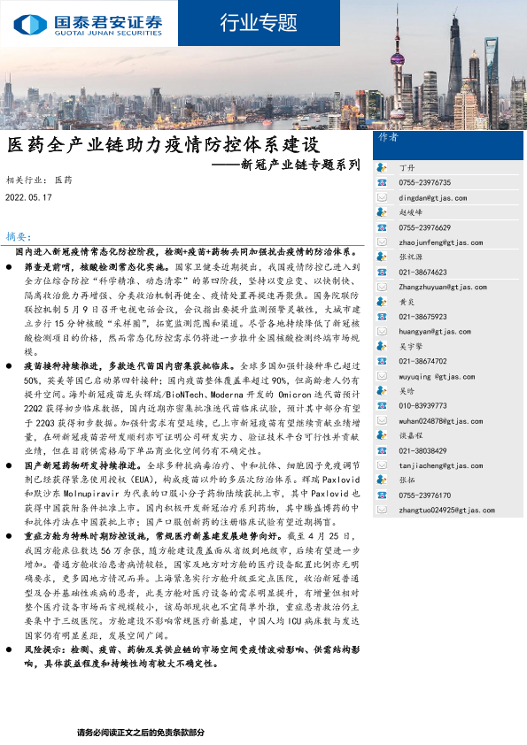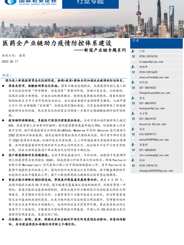 【国泰君安证券】【20220517】医药全产业链助力疫情防控体系建设-30页