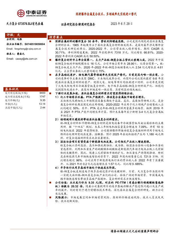 【中泰证券】【20230629】深耕爆炸金属复合技术,多领域率先实现进口替代-24页