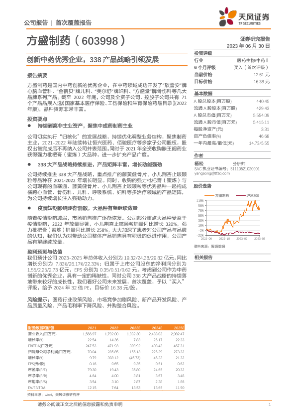 【天风证券】【20230630】20230630-天风证券-方盛制药-603998.SH-创新中药优秀企业,338产品战略引领发展-21页